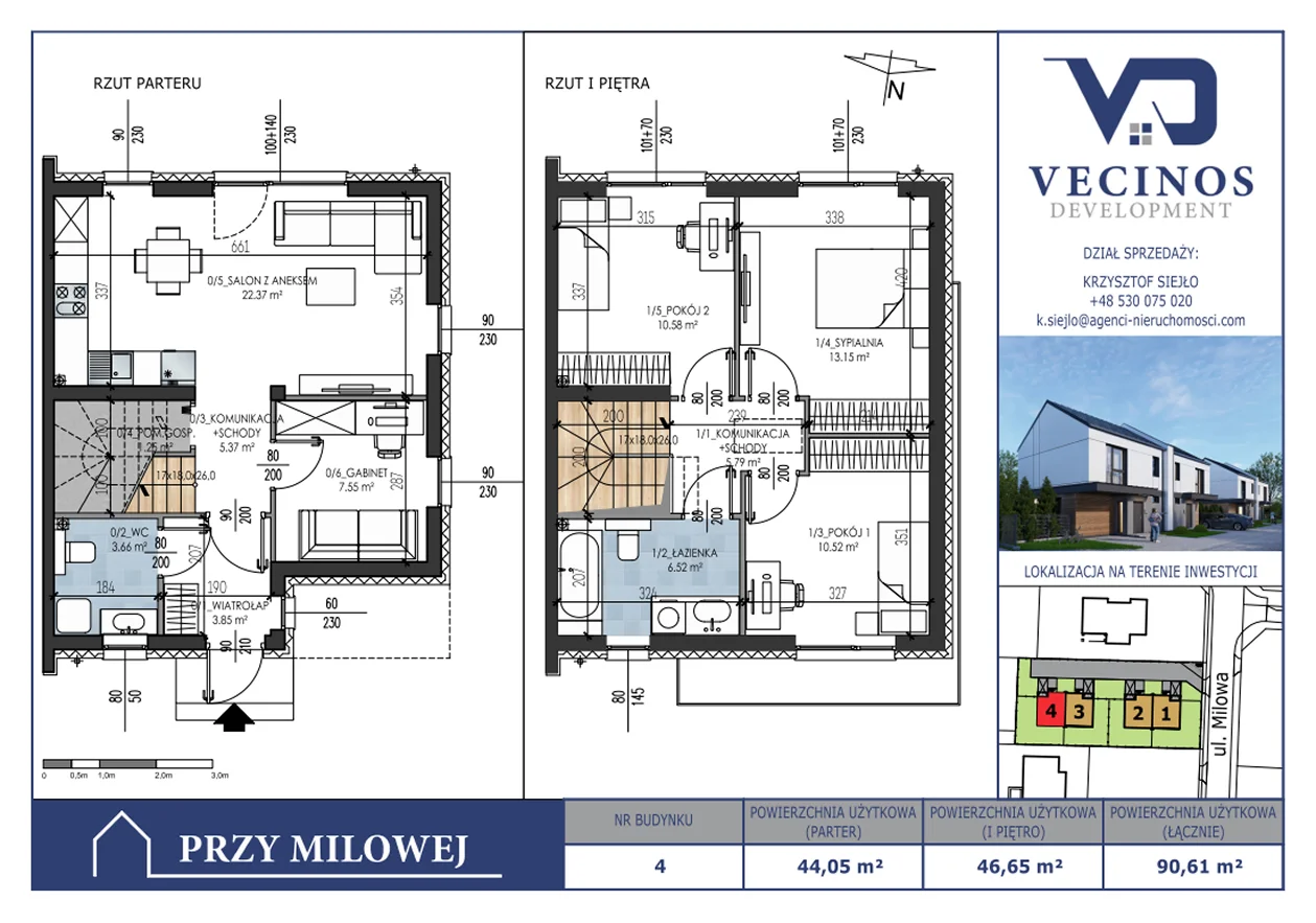 Parter domu to wygodna, otwarta strefa dzienna z salonem i aneksem kuchennym, której układ sprzyja naturalnej integracji – zarówno podczas rodzinnych spotkań, jak i codziennych rozmów przy kawie. Z salonu prowadzi wyjście do ogrodu, który staje się naturalnym przedłużeniem przestrzeni mieszkalnej. Dodatkowy pokój na parterze daje swobodę aranżacji, a piętro z trzema sypialniami i dużą łazienką gwarantuje każdemu z domowników własny, wygodny kąt i odrobinę prywatności.